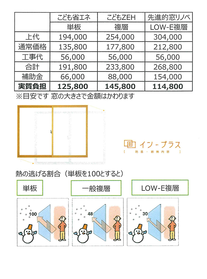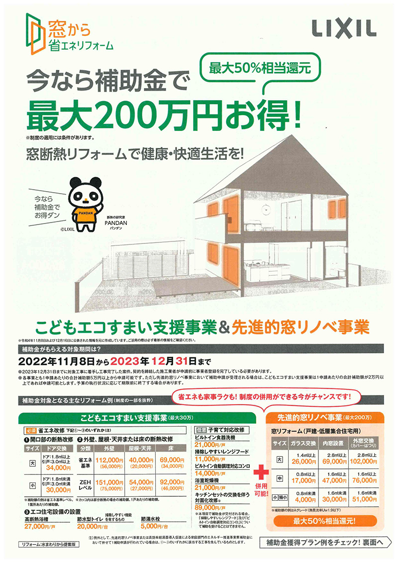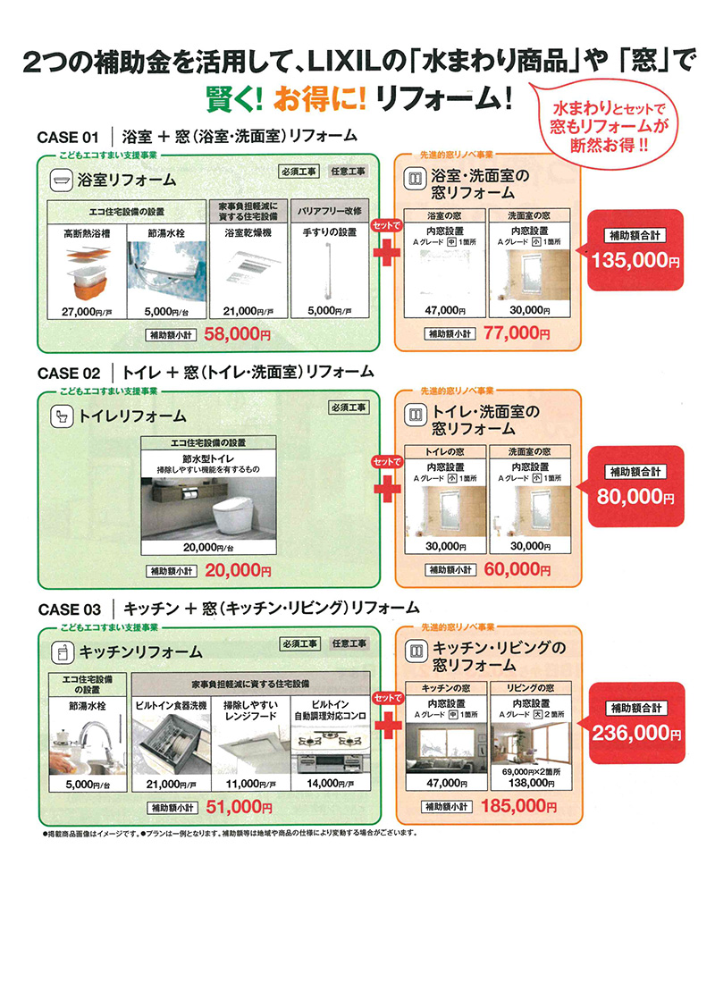 必須の断熱改修(内窓設置や複層ガラス交換など)と、エコ住宅設備の設置(高断熱浴槽設置や高効率給湯器設置など)など組み合わせてリフォームを行うことで、5万円以上の申請額となっていきます。