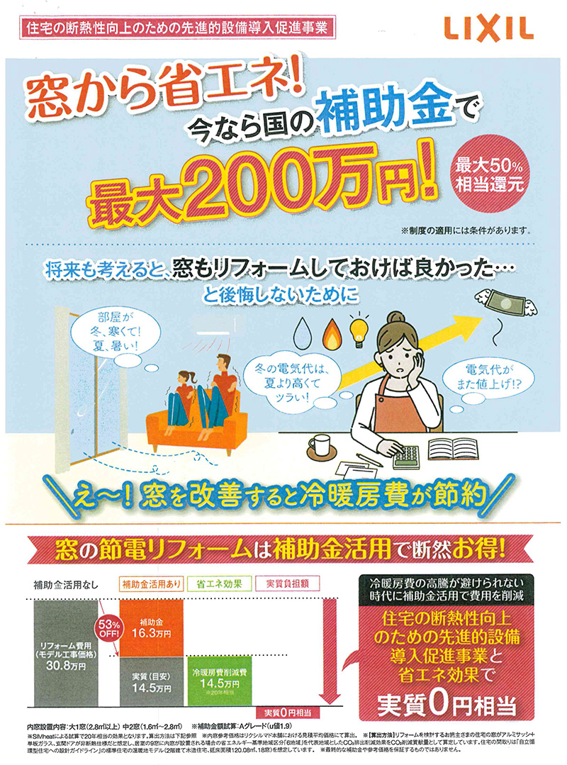 先進的窓リノベ事業は、既存住宅における窓の高断熱化を促進するため、改修に係る費用の一部を補助することで、エネルギー価格高騰への対応(冷暖房費負担の軽減)や、2030年度の家庭部門からのCO2排出量約7割削減(2013年度比)への貢献、2050年ストック平均でZEH基準の水準の省エネルギー性能の確保への貢献を目的とする事業です。