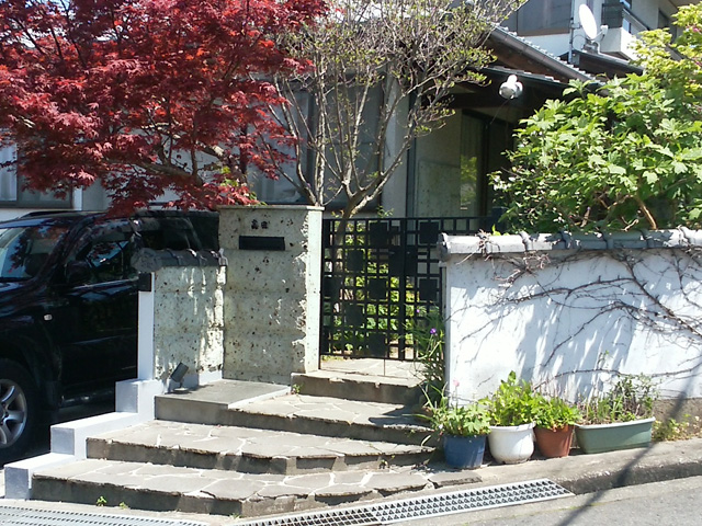 大谷石の存在感と鉄製の門扉による重厚感が深みを表しています。