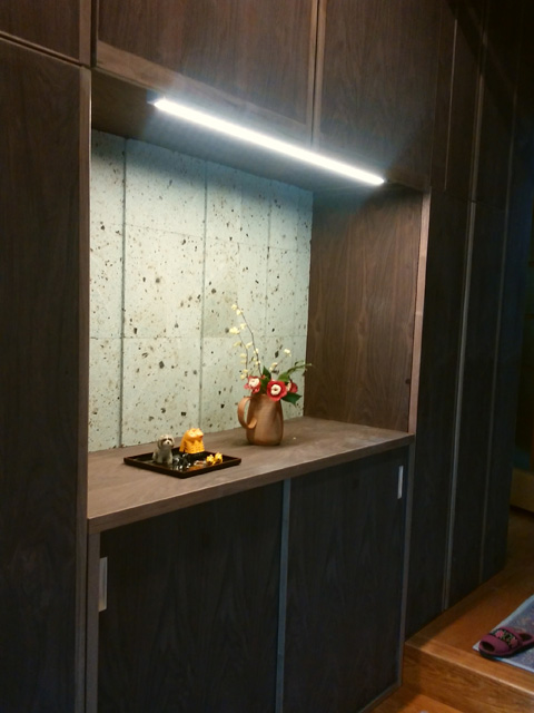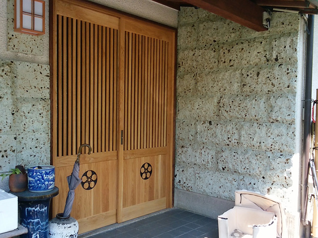 玄関横の壁に大谷石の(割り肌)をアクセントとして張ることによって和風住宅とのコントラクト